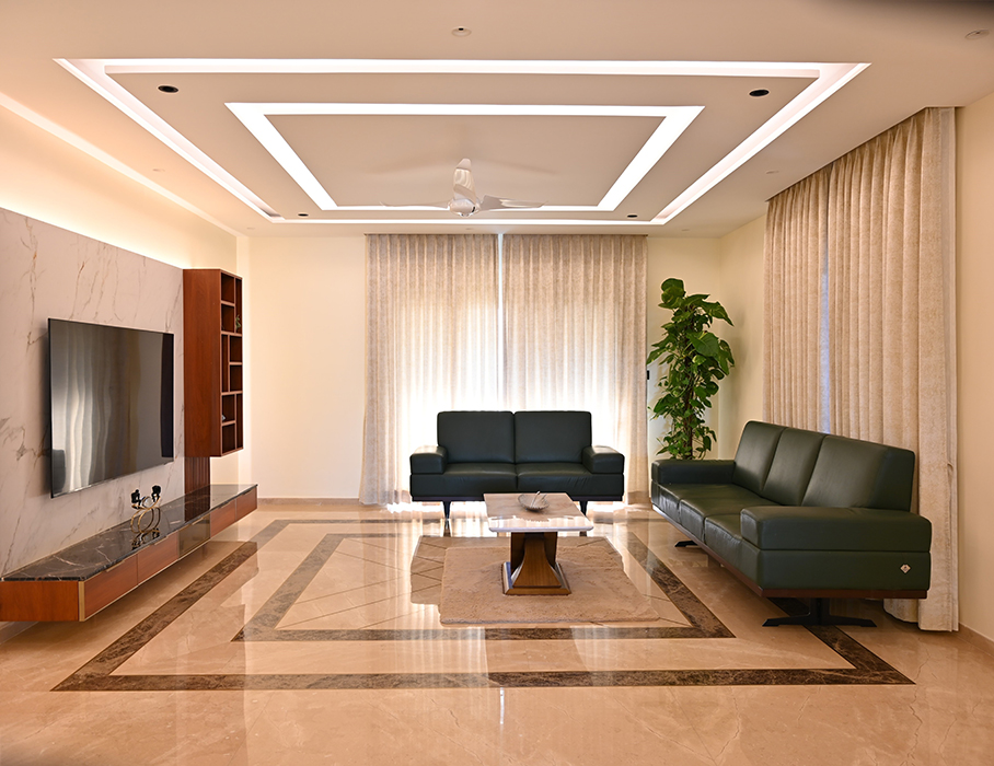 This 5 BHK residence features an intricate partition design in the foyer, leading to a finely crafted marble-clad TV unit. The dining area hosts a matching table with a designer light fixture at its center. A breakfast nook, blending seamlessly with the kitchen's color scheme, adds a touch of elegance.