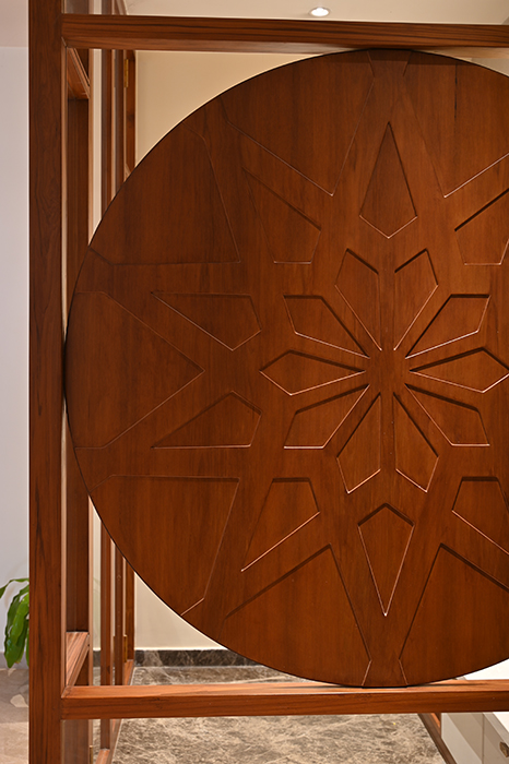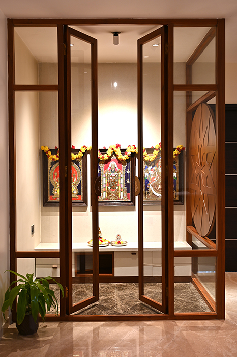 A sleek headboard and seating area accompany a guest wardrobe. A beautifully designed pooja area, enclosed by a glass partition with a designer wood carving, stands opposite a detailed office workstation.