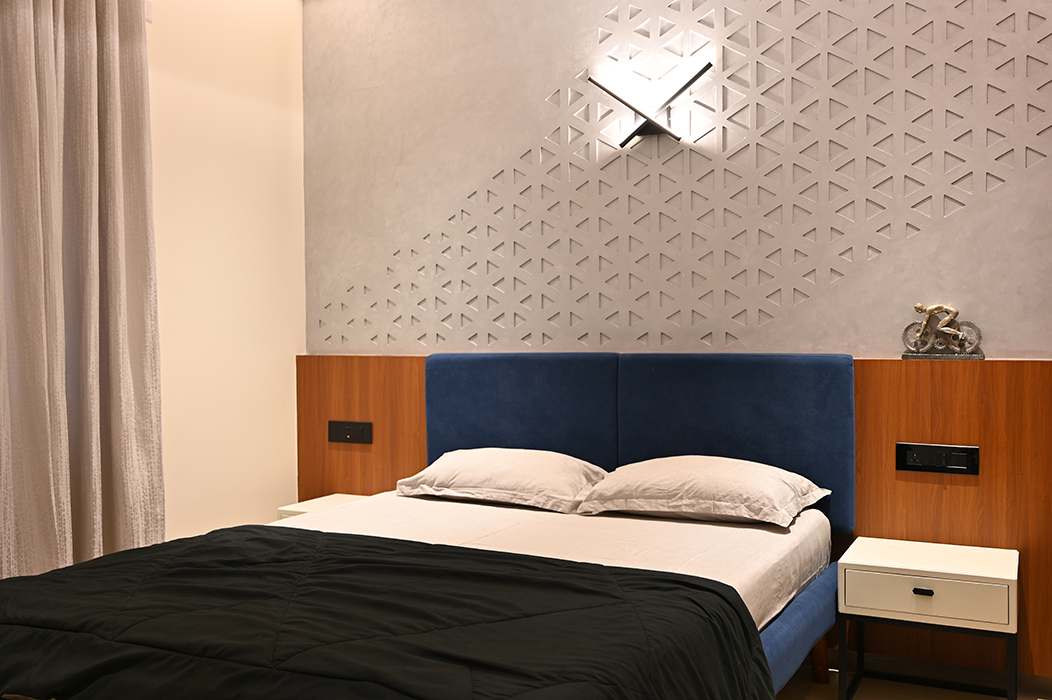 The master bedroom is accentuated by vertical lines in a concrete finish, the wardrobe incorporating the scooped-out volumes juxtaposed with solid ones against the wall creates an intriguing design. The other two bedrooms boast simpler backdrops with splashes of color. The guest bedroom on the second floor features a blend of wood and blue decor for the headboard. A cozy conversation area transitions to the open terrace.