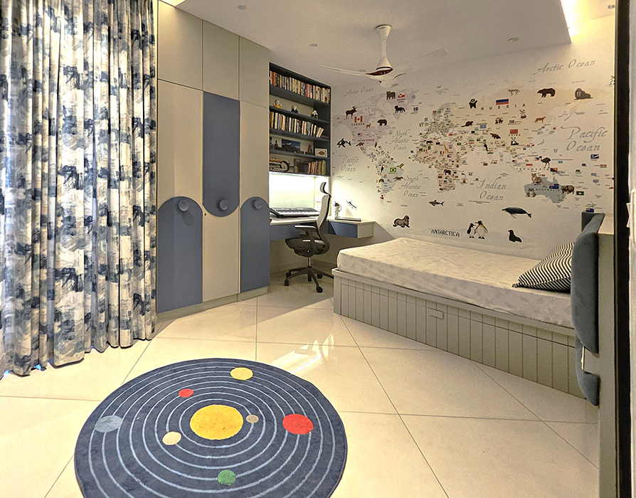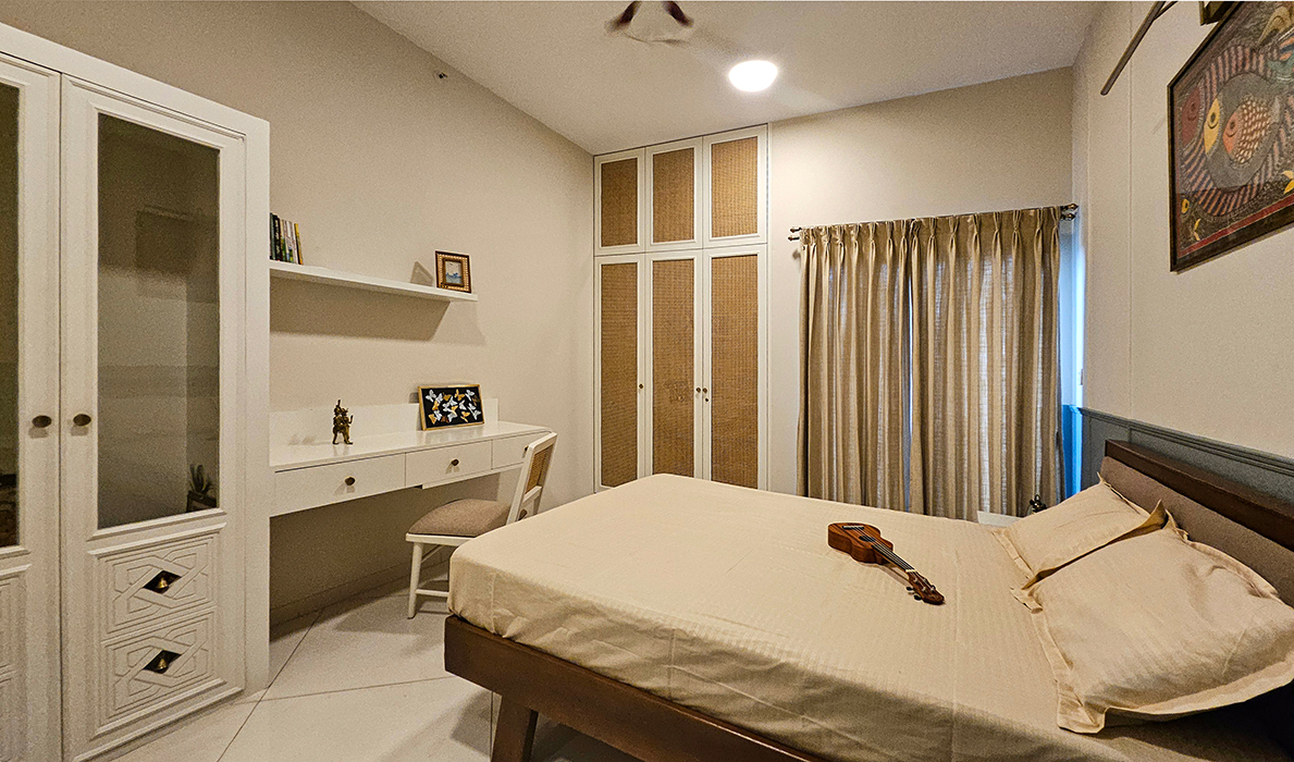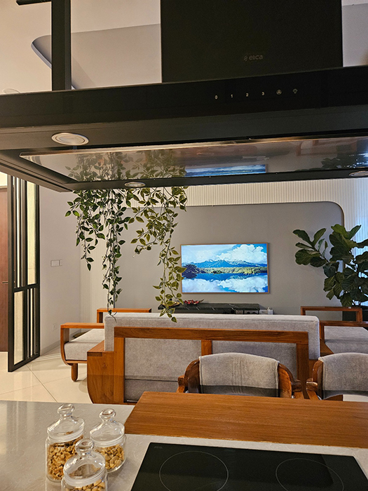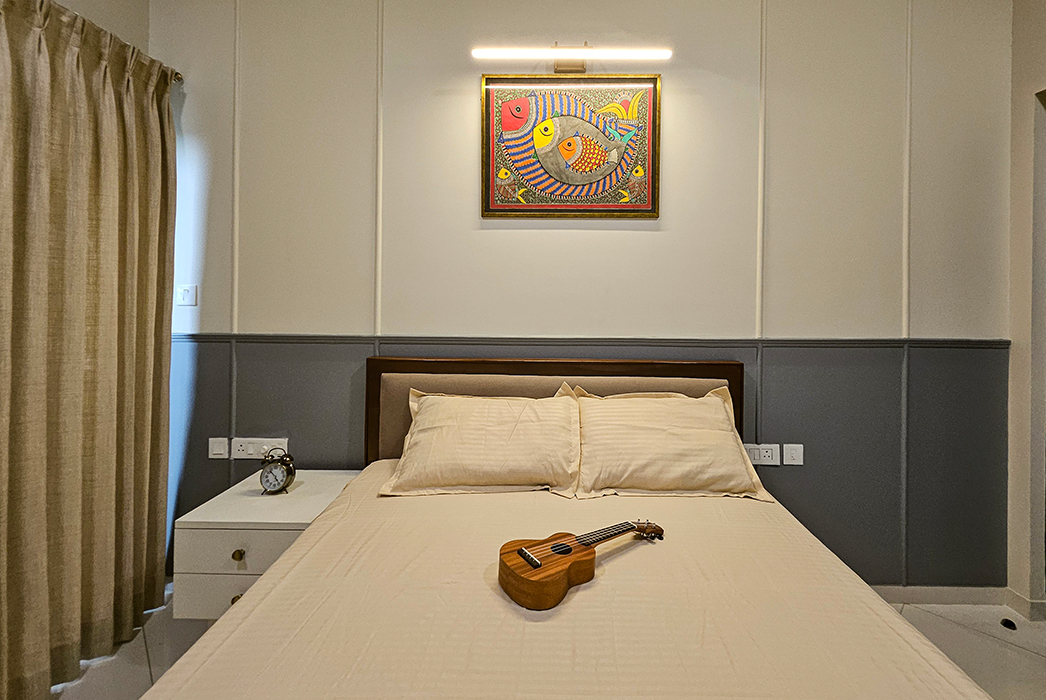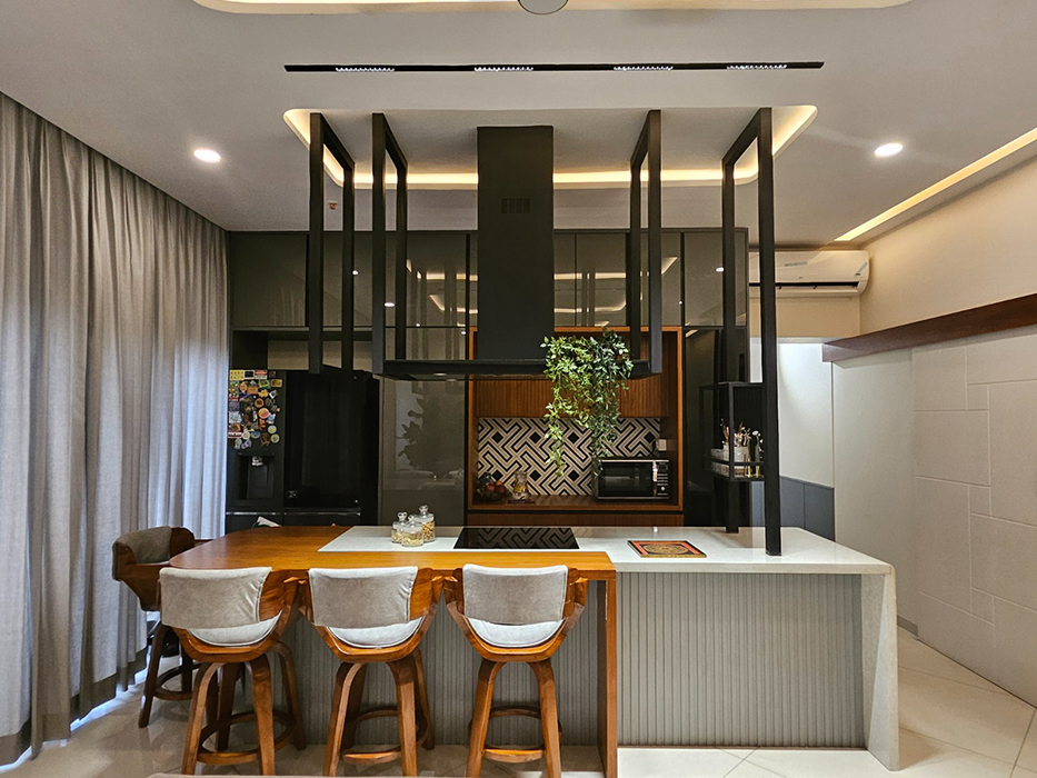 The design boasts a minimalist approach with simplified forms and clean lines, while eclectic accents incorporating modern or abstract art pieces add a touch of elegance. The spacious interior includes an open-plan living room and kitchen, a serene master bedroom, a cozy kids' bedroom doubling as a workspace, and a stylish guest bedroom, all perfectly balancing opulence and simplicity to create a timeless and sophisticated living space.