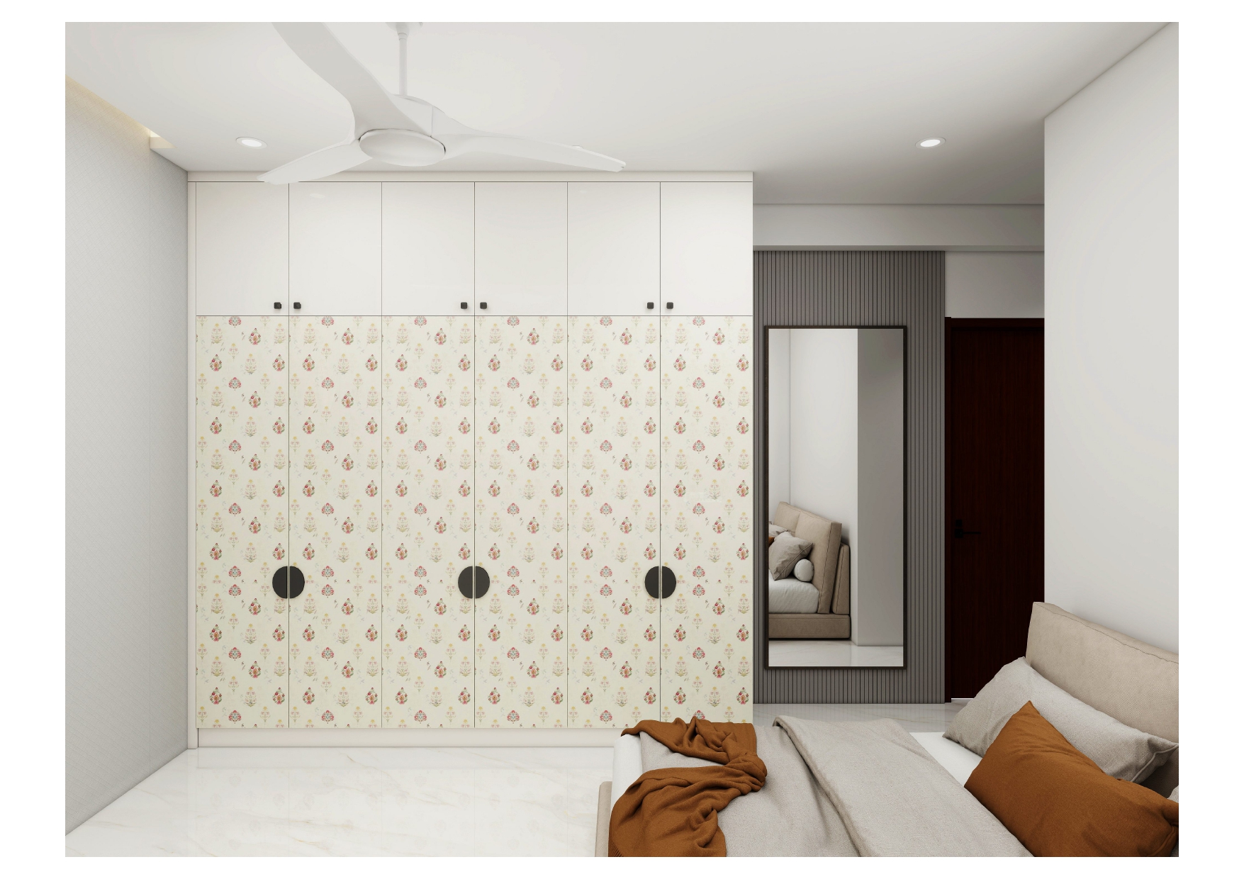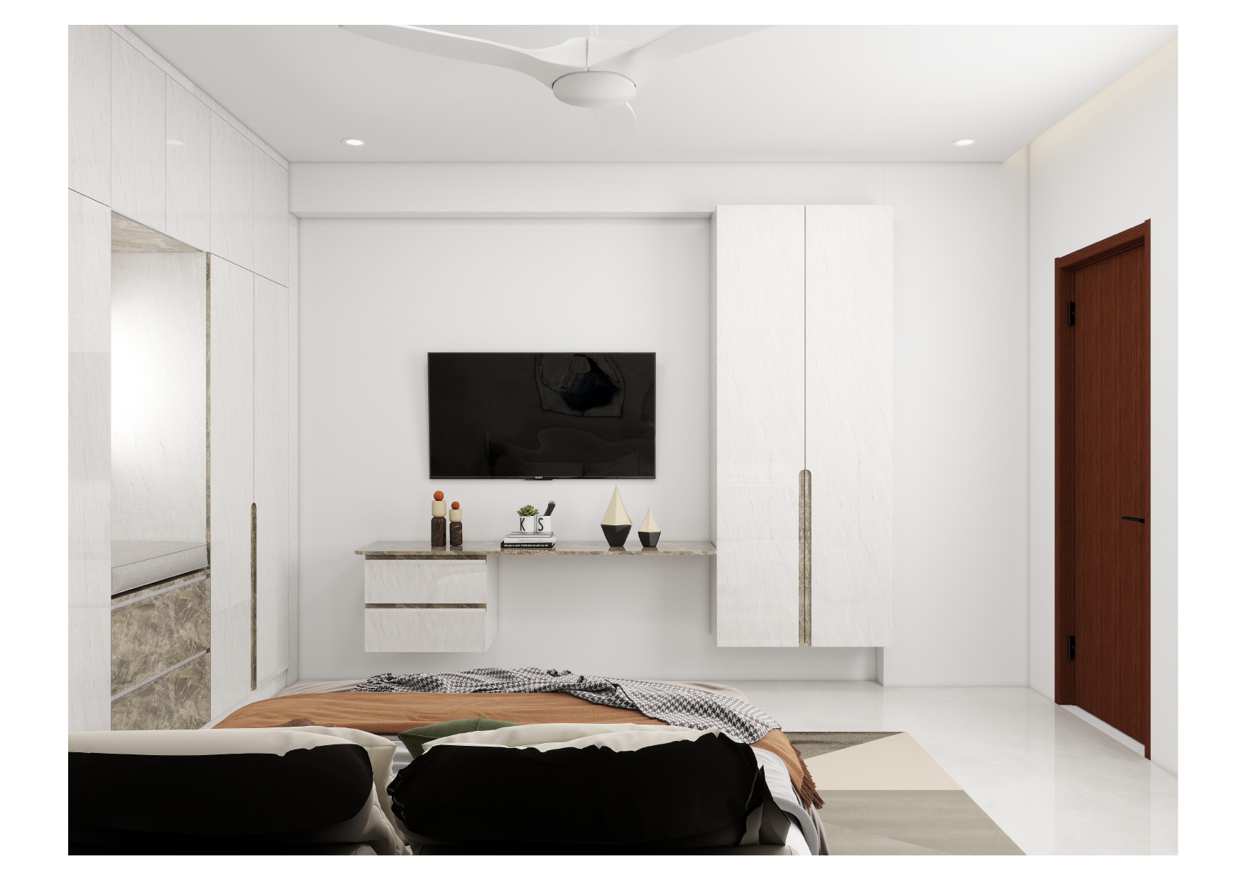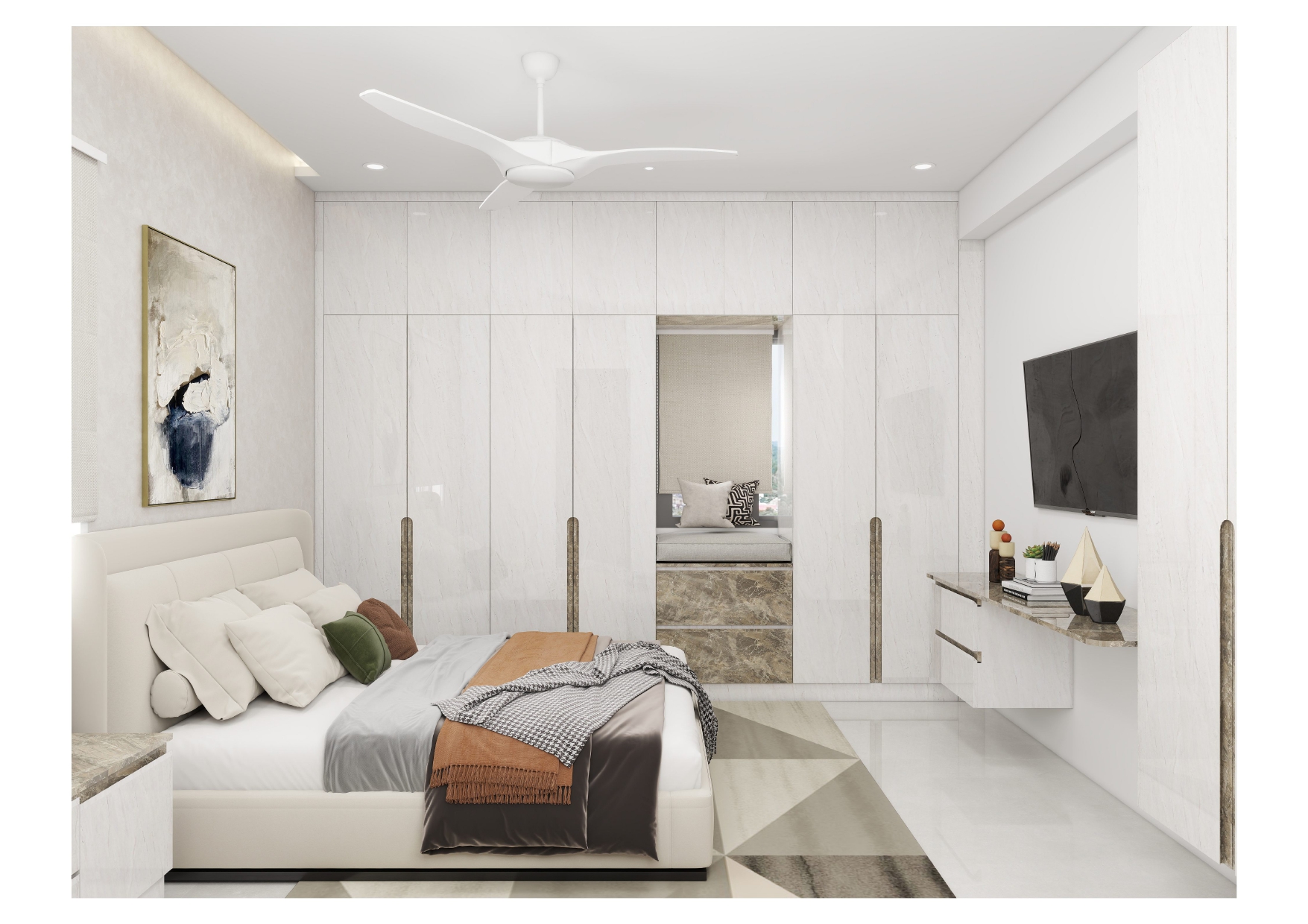 Bedrooms prioritize calm comfort with custom minimalist wardrobes, soft neutral furnishings, and restrained décor. Thoughtful textures add warmth and depth to the serene white scheme.