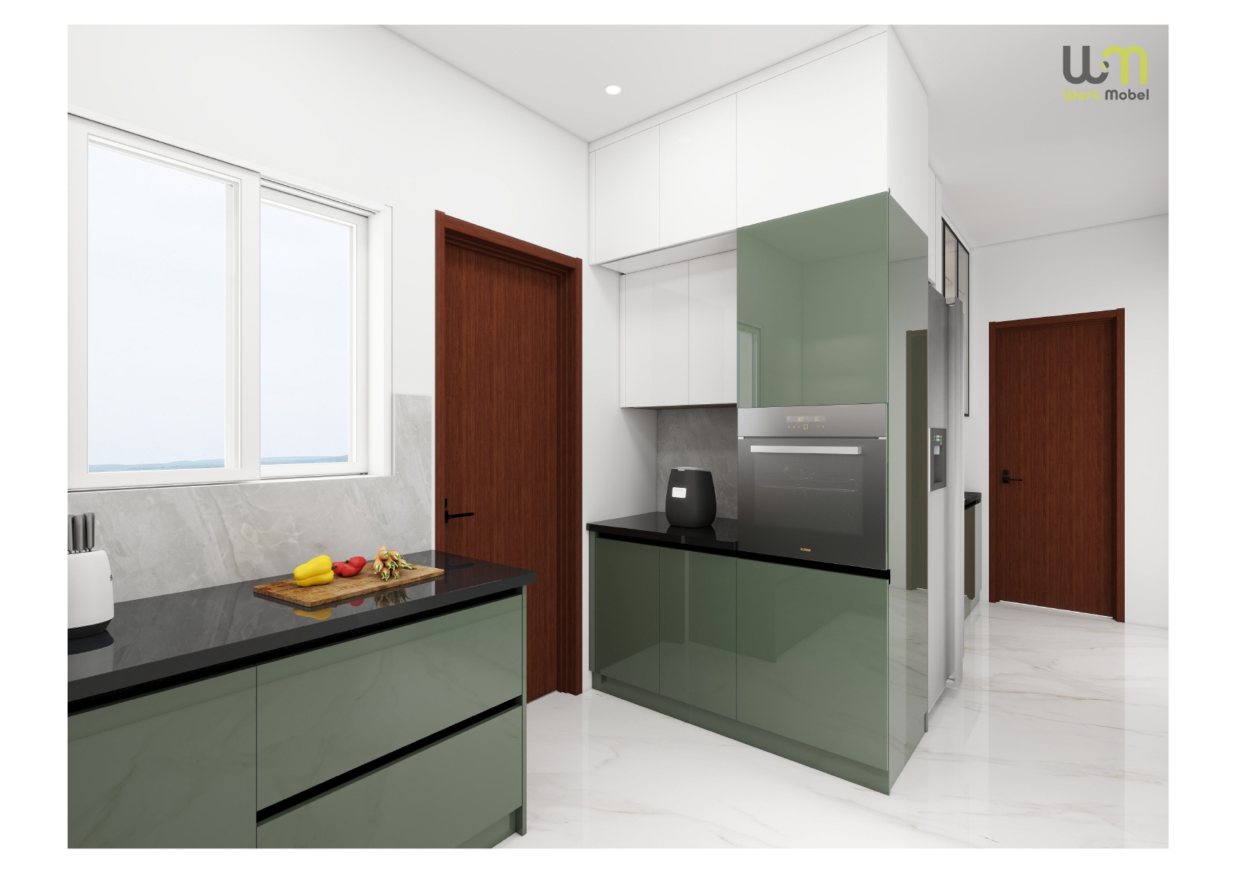 The kitchen showcases sleek handle-less cabinets, crisp white countertops, and integrated storage that blends functionality with refined simplicity. Soft accent lighting elevates the minimalist ambiance.
