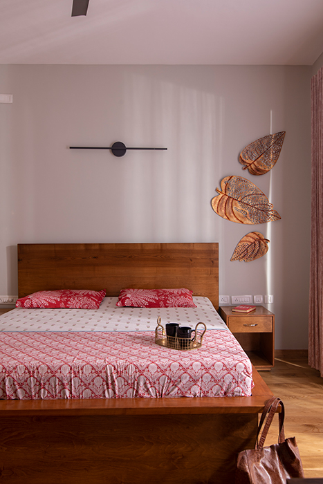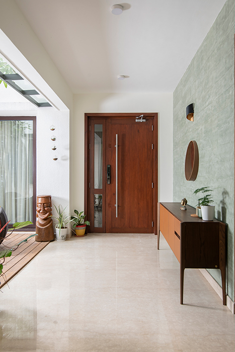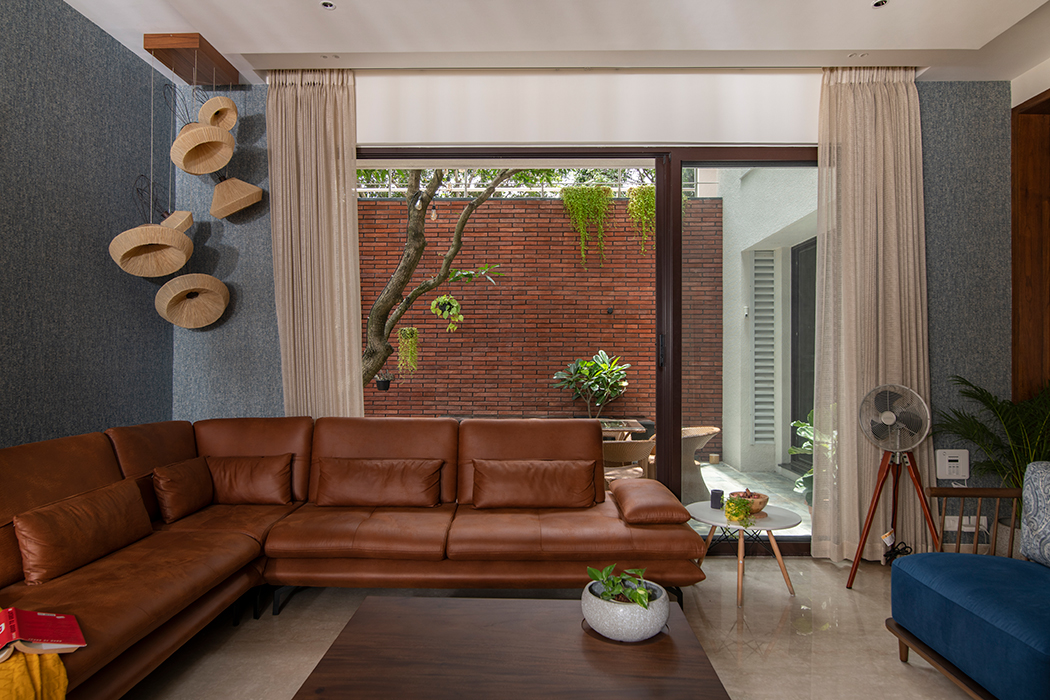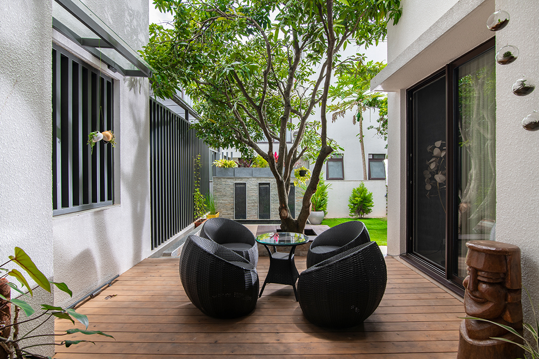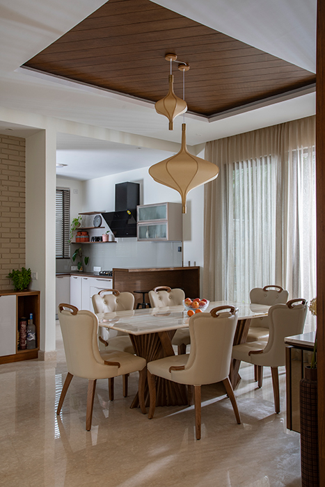 This contemporary-style villa boasts modern design elements and is situated amidst lush greenery. The inviting living room features a brick-lined wall, while the dining area is adorned with a stunning wood ceiling. A white brick textured wall complements the bar counter and adds a pop of contrast.