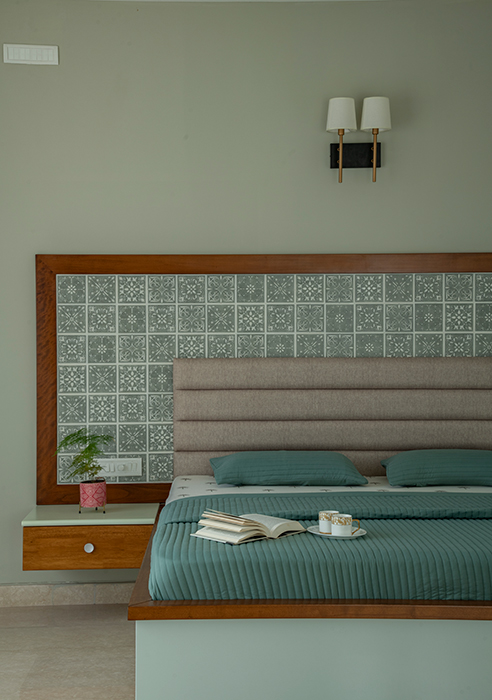On the first floor, a custom-designed metal grill separates the living room from the master bedroom, which boasts green Moroccan tiles. Two kids' bedrooms showcase personalized design elements, and the guest bedroom has a cozy atmosphere with wallpaper. The villa is surrounded by greenery, creating a warm and inviting ambiance.