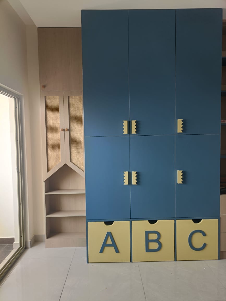 The kitchen is sleek and contemporary, featuring handle-less cabinets, elegant countertops, and integrated storage solutions that combine style with functionality. Accent lighting highlights the modern design elements and enhances the overall ambiance.