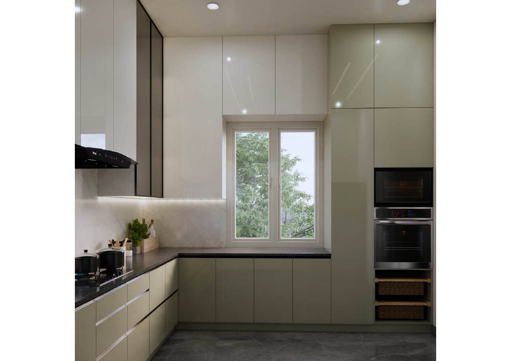 The kitchen showcases sleek handle-less cabinets, crisp white countertops, and integrated storage that blends functionality with refined simplicity. Soft accent lighting elevates the minimalist ambiance.