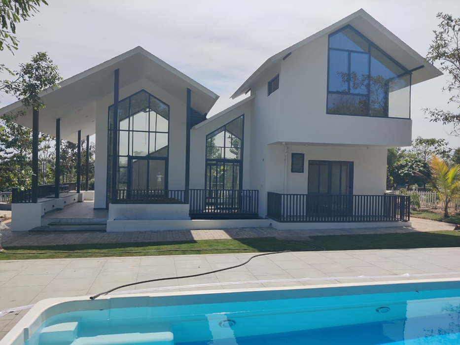 This 3BHK farmhouse boasts a sleek, contemporary aesthetic, with a glass facade that showcases stunning surroundings. Each room features unique character, thanks to platform beds, bay windows, and breathtaking outdoor views. Perfect for a tranquil retreat from city life, this home epitomizes relaxed, country living.