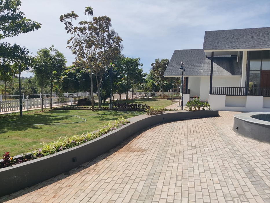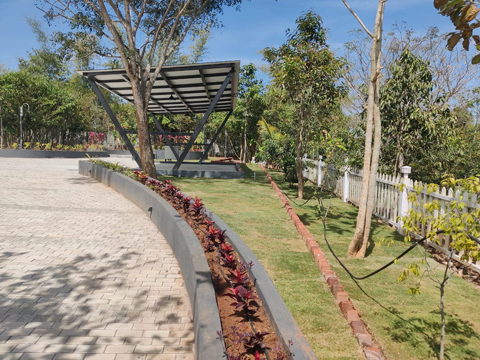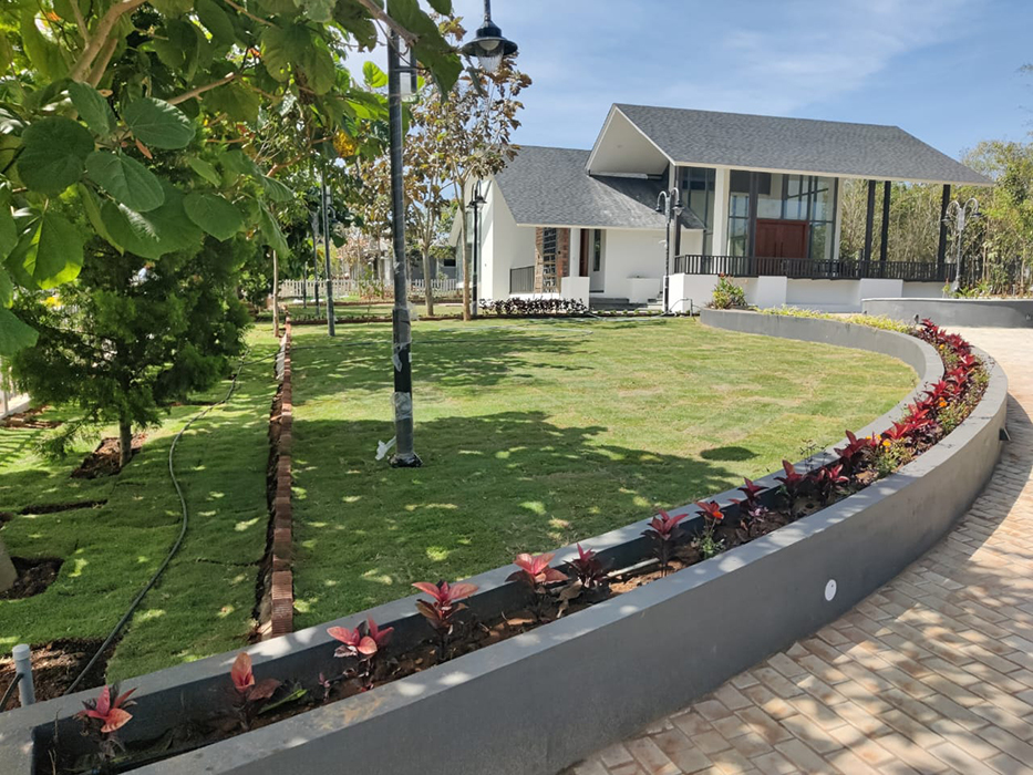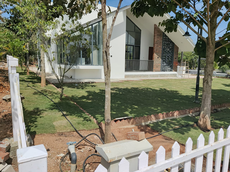 Nestled in Triguna Country Homes, this contemporary farmhouse redefines rural luxury. The sloping shingled roof, punctuated by skylights, creates a sense of fluidity and openness. Tall roof heights and abundant natural light flood the interior, blending modern design with rural charm.