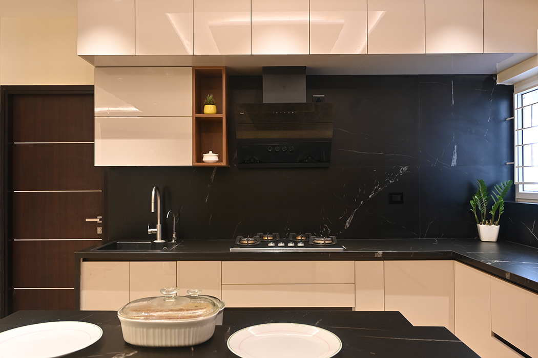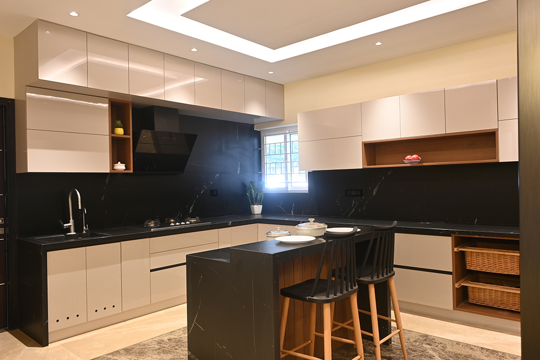 This 5 BHK residence features an intricate partition design in the foyer, leading to a finely crafted marble-clad TV unit. The dining area hosts a matching table with a designer light fixture at its center. A breakfast nook, blending seamlessly with the kitchen's color scheme, adds a touch of elegance.