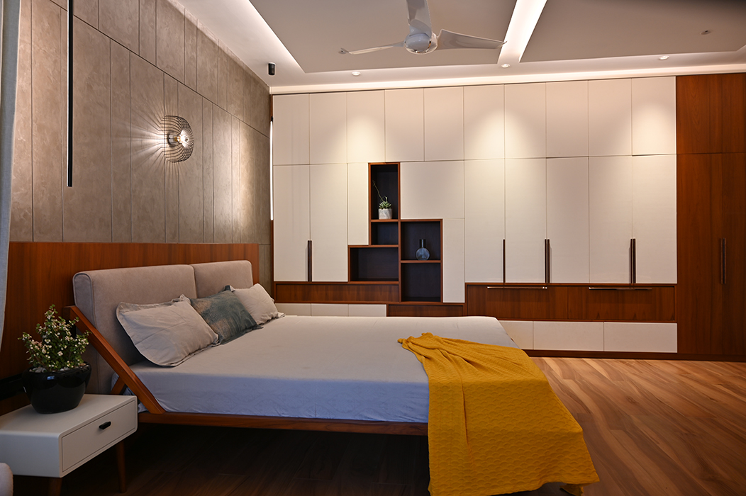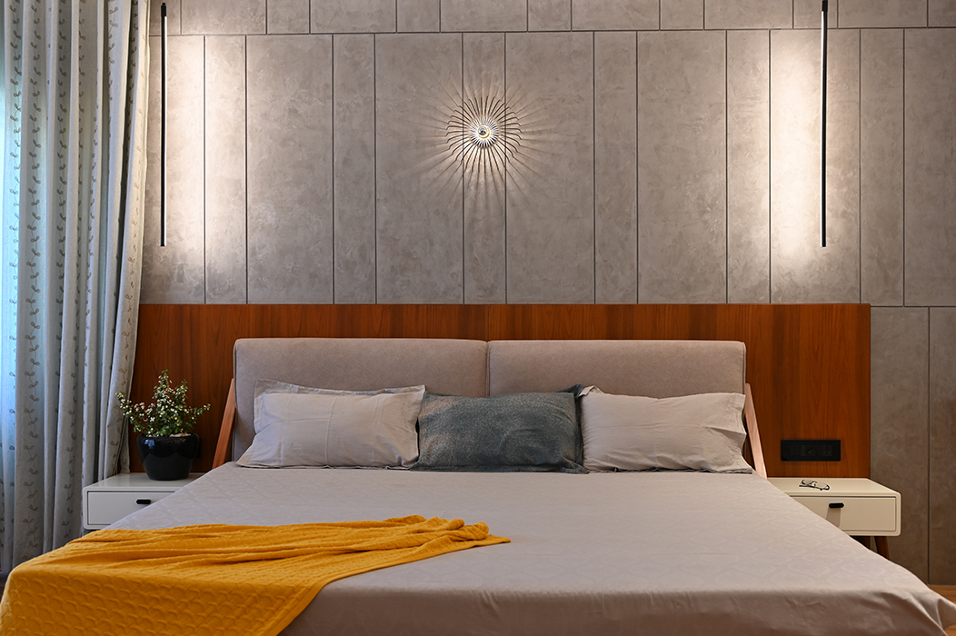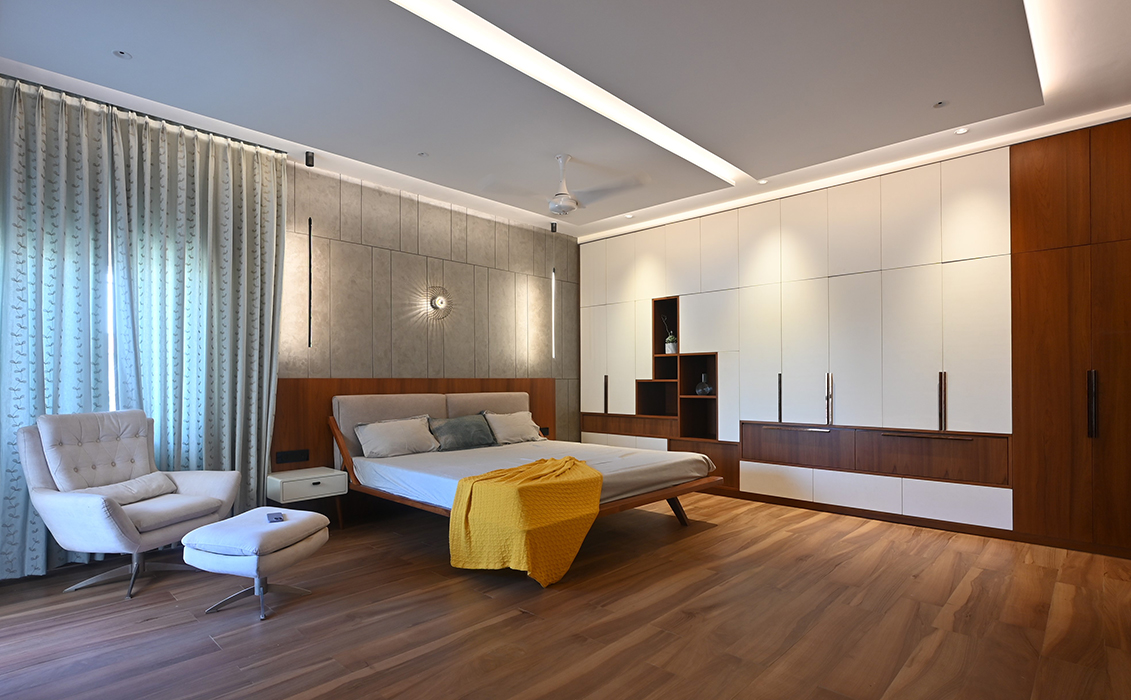The master bedroom is accentuated by vertical lines in a concrete finish, the wardrobe incorporating the scooped-out volumes juxtaposed with solid ones against the wall creates an intriguing design. The other two bedrooms boast simpler backdrops with splashes of color. The guest bedroom on the second floor features a blend of wood and blue decor for the headboard. A cozy conversation area transitions to the open terrace.
