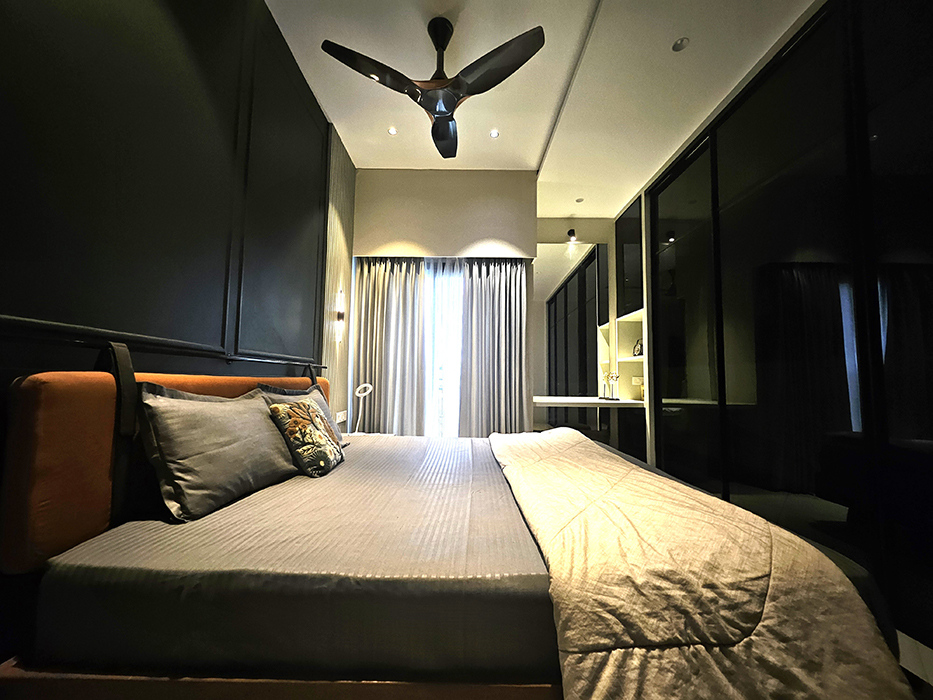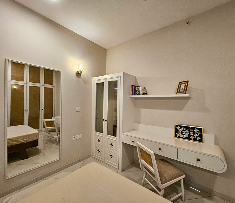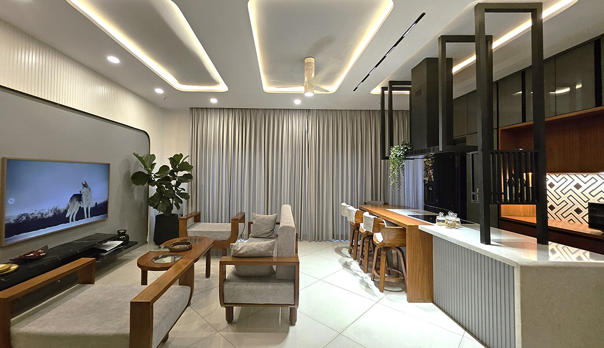 The design boasts a minimalist approach with simplified forms and clean lines, while eclectic accents incorporating modern or abstract art pieces add a touch of elegance. The spacious interior includes an open-plan living room and kitchen, a serene master bedroom, a cozy kids' bedroom doubling as a workspace, and a stylish guest bedroom, all perfectly balancing opulence and simplicity to create a timeless and sophisticated living space.