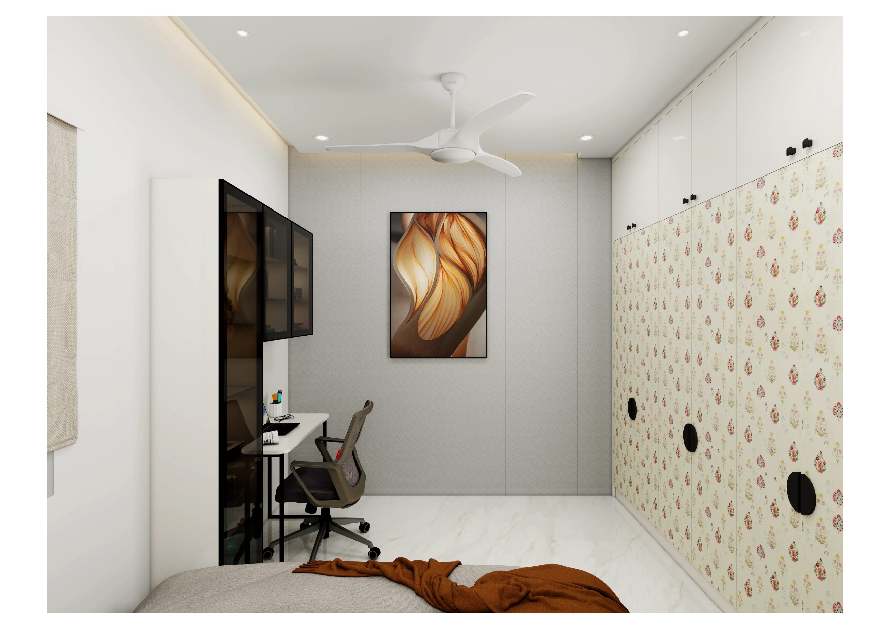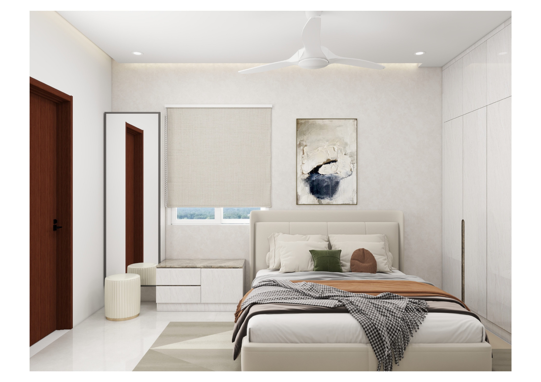 Bedrooms prioritize calm comfort with custom minimalist wardrobes, soft neutral furnishings, and restrained décor. Thoughtful textures add warmth and depth to the serene white scheme.