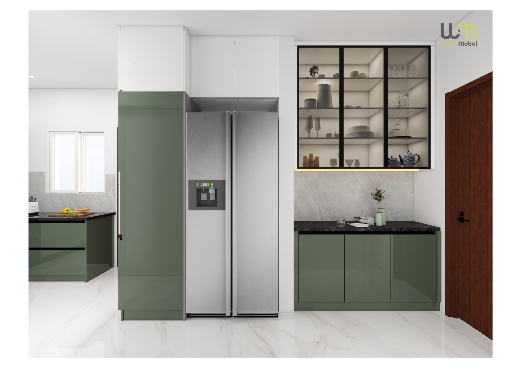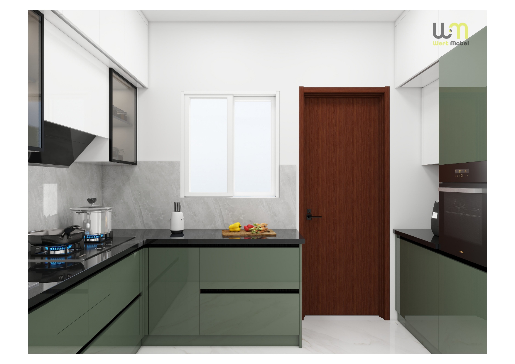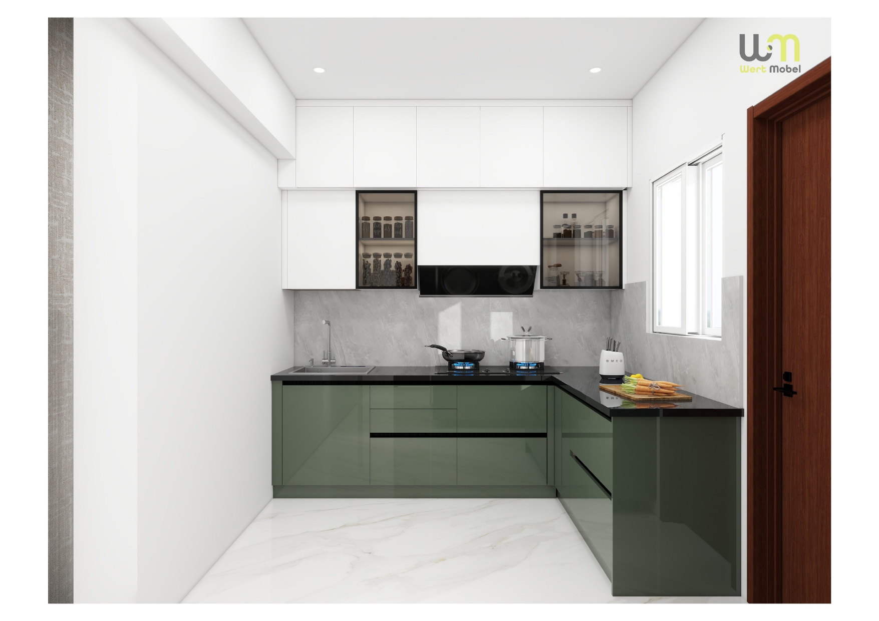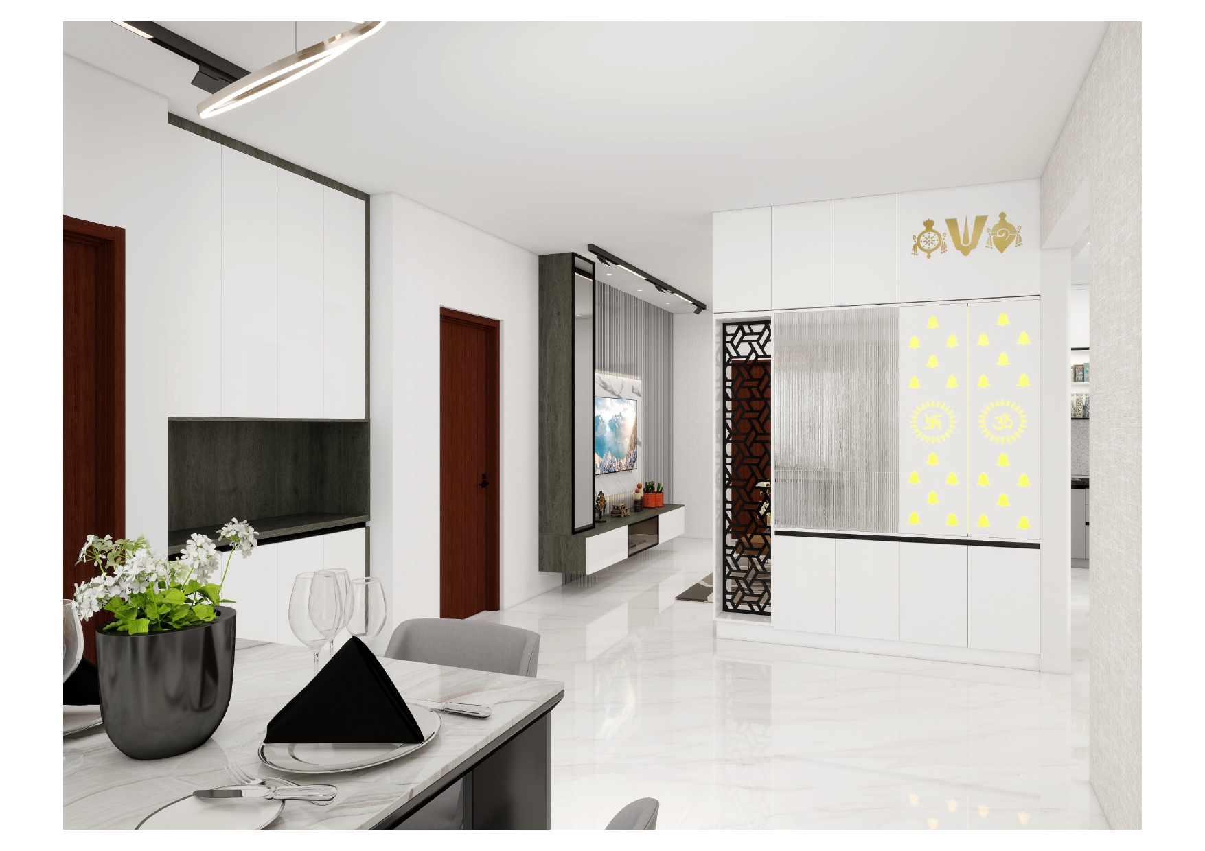 The kitchen showcases sleek handle-less cabinets, crisp white countertops, and integrated storage that blends functionality with refined simplicity. Soft accent lighting elevates the minimalist ambiance.