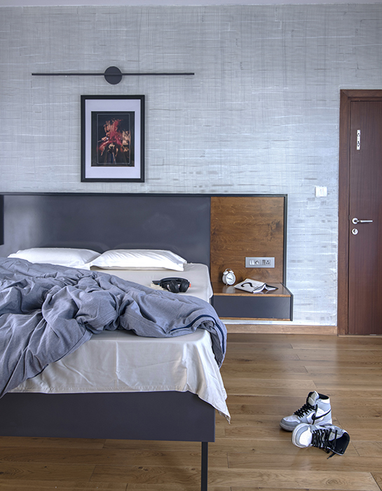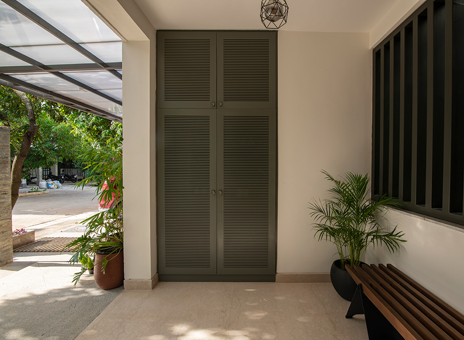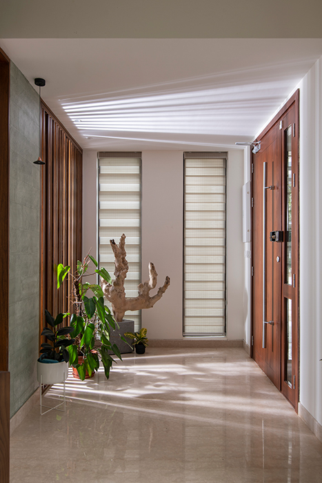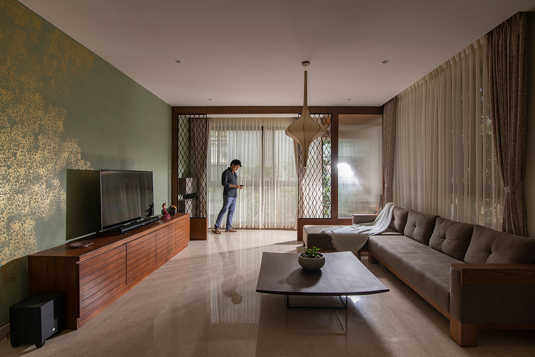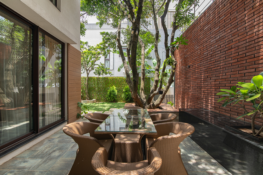 This contemporary-style villa boasts modern design elements and is situated amidst lush greenery. The inviting living room features a brick-lined wall, while the dining area is adorned with a stunning wood ceiling. A white brick textured wall complements the bar counter and adds a pop of contrast.