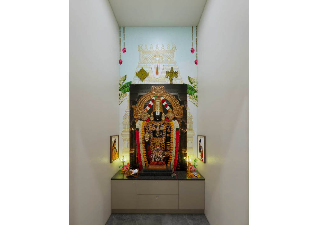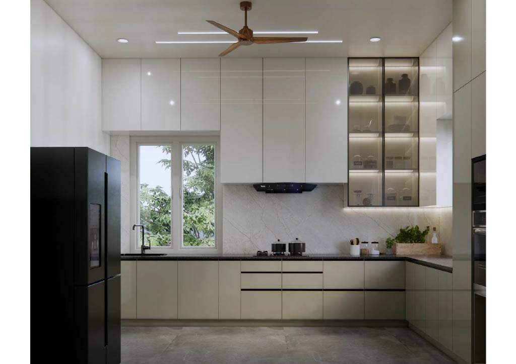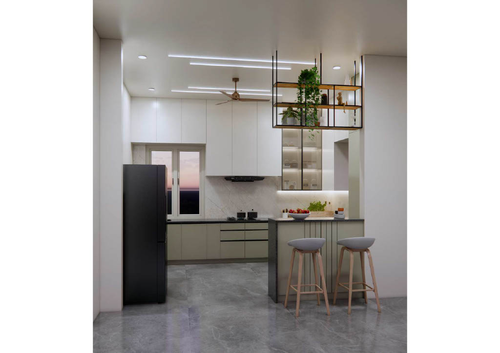 The kitchen showcases sleek handle-less cabinets, crisp white countertops, and integrated storage that blends functionality with refined simplicity. Soft accent lighting elevates the minimalist ambiance.